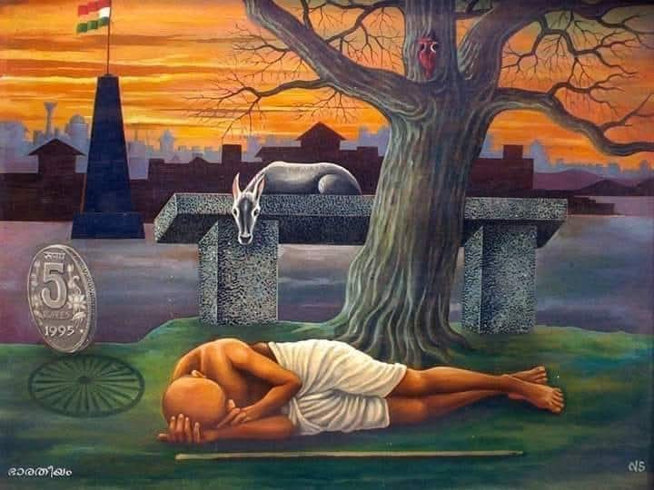 "എന്റെ ചിത്രങ്ങളിൽ 'ഭാരതീയ' മാണെന്റെ മാസ്റ്റർപീസ് " എന്ന് ചിത്രകാരൻ തന്നെ പറഞ്ഞിട്ടുള്ളതാണ്. ചിത്രത്തി നുള്ള ബീജം കിട്ടിയത് ഒരു പ്രത്യക്ഷാനുഭവത്തിൽ നിന്നാണെങ്കിലും അത് പൂർണമായപ്പോൾ പലതലമുള്ള ഒരു രാക്ഷ്ട്രീയ - ജനകീയ ചിത്രമായിമാറി. രക്തസാക്ഷിമണ്ഡപത്തിൽ ഉയർന്നു നിൽക്കുന്ന ദേശീയപതാകയിൽ നിന്ന് ചക്രം ഉരുണ്ടു നിലത്തെത്തുന്നു. ഭാരം ചുമക്കുന്ന കഴുത ഭാരമിറക്കി വയ്ക്കുന്ന ചുമടുതാങ്ങിയിൽ വിശ്രമിക്കുന്നു. ഗാന്ധി നിദ്രയിലാണ്. (അതോ ബോധരഹിതനായി വീണതോ ആവാം. മരത്തിലെ പക്ഷി കാലസാക്ഷിയായുണ്ട്. ജേർണി ടു എറ്റേണിറ്റി, ഡെഡിക്കേഷൻ, നിറം മാറുന്ന കൊടികൾ, (അടിയന്തരാവ സ്ഥയിൽ വരച്ചത്) ട്രാപ്പ്, മാനവീയം, രാധാമാധവം ഇങ്ങനെ ഒട്ടേറെ ചിത്രങ്ങൾ ശ്രദ്ധേയമാണ്.വിശ്വാസ ത്തിന്റെ കടിഞ്ഞാൺ എന്ന ചിത്രം, വെളുത്തതും കറുത്തതുമായ രണ്ടു കുതിരയെ നിയന്ത്രിക്കുന്ന മനുഷ്യനെ അവഗണിച്ച് ഇരുവശത്തേക്കു കുതിയ്ക്കുന്നു. കുരുക്കിട്ടു പിടിച്ചിരിക്കുന്നതിനാൽ ആ കുതിരശക്തിയിൽ അയാൾക്ക് പിളർന്നുന്നു മാറുകയേ നിവൃത്തിയുള്ളൂ. ഇത്ര നിയന്ത്രണത്തിൻ്റെ ട്രാജഡി ഇരുളും വെളിച്ചവും കാട്ടുന്ന പലതലങ്ങളിൽ ബലതന്ത്രം പ്രയോഗി ക്കുന്നു. ഭ്രമകല്പനകളുടെ സംലയം ചില ചിത്രങ്ങൾ മുന്നോട്ടുവയ്ക്കുന്നു. 'ആർത്തി ' രാക്ഷസത്തിരയെ ഓർമി പ്പിക്കുന്ന ഒരു വർണചിത്രമാണ്. അതുപോലെ, ഉന്മാദം, രതി, പതനം 1 , പതനം 2 തുടങ്ങി പല ചിത്രങ്ങളുമുണ്ട്. "അനന്തതയിലേക്ക് ഒരു യാത്ര'യില് യാഥാസ്ഥിതികത്വത്തിന്റെ വേരുകളിൽ പിറക്കുമ്പോഴേ കുരുങ്ങിപ്പോയൊരു കുഞ്ഞിന്റെ മുഖം. അതാണ് ചിത്ര ത്തിന്റെ ബീജമെങ്കിലും ജന്മവും ജനനവും ജനിതകവുമെല്ലാം നിർണയിക്കുന്ന ഒരു ഗർഭപാത്രത്തെയും ആ ചിത്രത്തിൽ ദർശിക്കാം. സൂക്ഷ്മ പരിശോധനയിൽ അനന്തയിലേക്കുള്ള ആ യാത്രയുടെ വാഹനവും അതിൽ കാണാം. അന്തമില്ലാത്ത യാത്ര പോലെ അനന്തമായ അർഥസാധ്യത നൽകുന്നു.